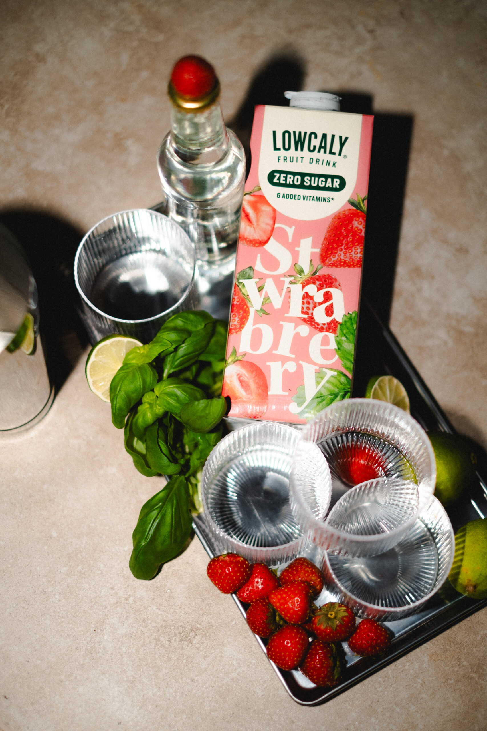- Skaka tillsammans med limejuice, Lowcaly Fruktdryck Strawberry och is i en shaker.